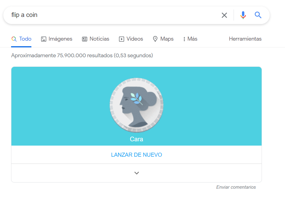- Necesitas una moneda para decidir algo a cara o cruz, pero como lo pagas todo con contactless no eres capaz de encontrar ninguna en tu bolsillo o cartera. Pero no pasa nada, si pones flip a coin en la barra de búsqueda podrás lanzar una moneda virtual al aire y que el azar siga decidiendo por ti.