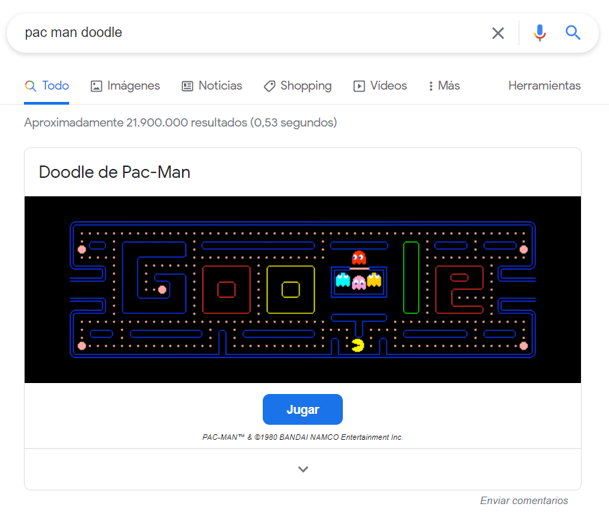 - Si con el juego del tiranosaurio no te has divertido lo suficiente y ya has conseguido conectarte al wifi escribe en la barra de navegación pac man doodle. Cuando presiones enter seguramente se apodere de ti la nostalgia.