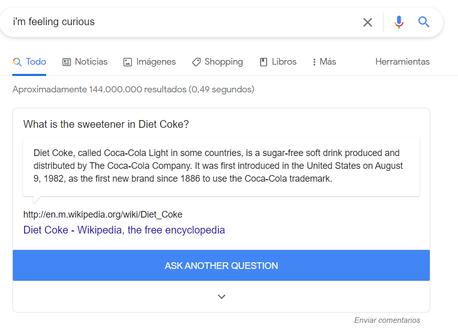 - Nunca te irás a dormir sin saber una cosa nueva, dicen. Y si por lo que sea hoy no has saciado tu curiosidad como es debido, prueba a buscar fun facts o I’m feeling curious. Con ello, obtendrás resultados de hechos y curiosidades aleatorias.